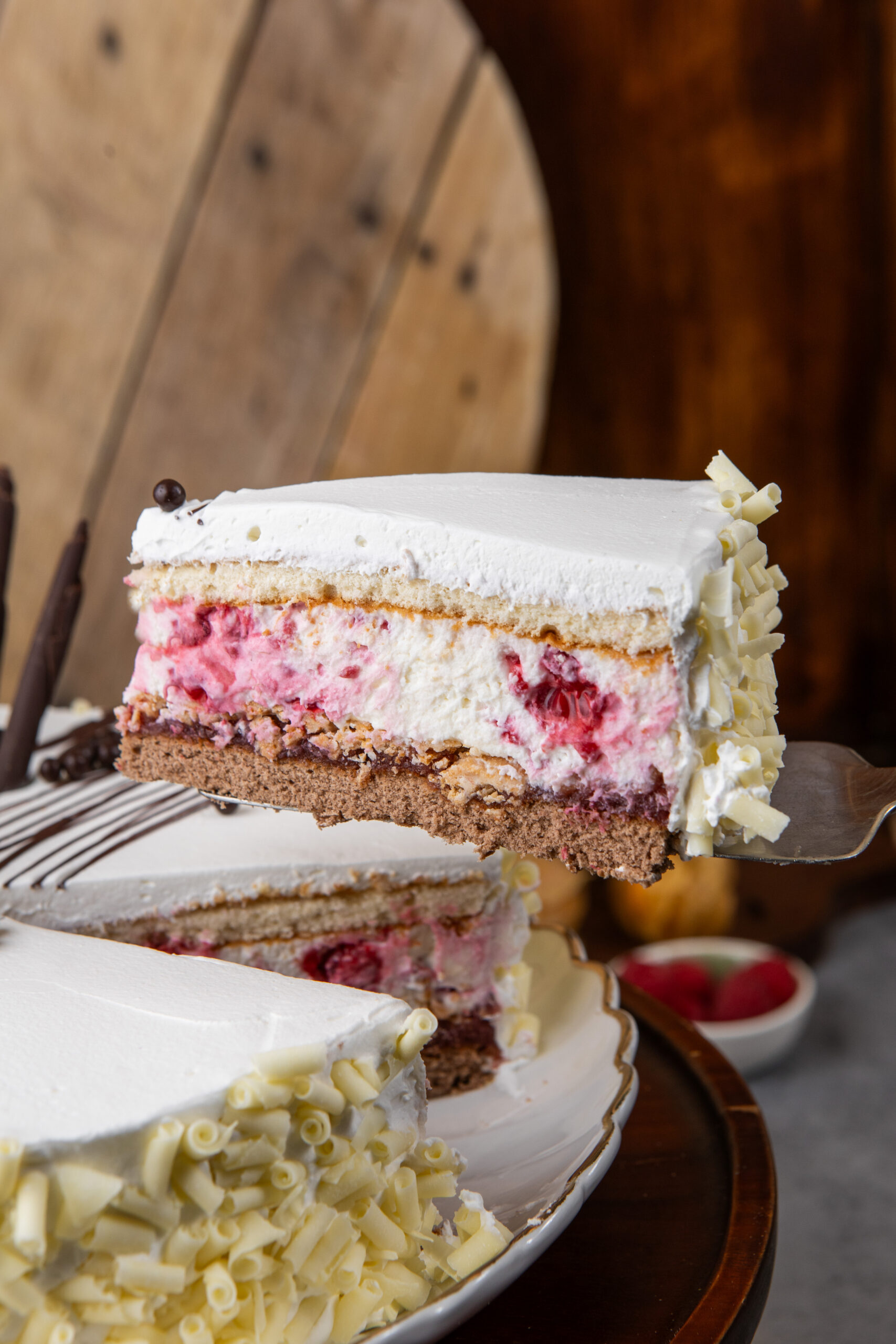 Curd cheese and raspberry cake “Romanss” 1,5 kg40.00 € Curd cheese and raspberry cake with cocoa biscuit base, white chocolate, waffle and whipped cream. Cake is decorated with physalis and chocolate. The cake can serve 12-14 persons. Add to cart Back to shop Related products Cherry-mascarpone cake 21.00 € – 36.00 €Price range: 21.00 € through 36.00 € Select options This product has multiple variants. The options may be chosen on the product page Read more Belgian chocolate-curd cheese cake 20.00 € – 36.00 €Price range: 20.00 € through 36.00 € Select options This product has multiple variants. The options may be chosen on the product page Read more Chocolate and cream cheese cake 2 kg 42.00 € Add to cart Read more Cake “Olümpia” 2,0 kg 40.00 € Add to cart Read more